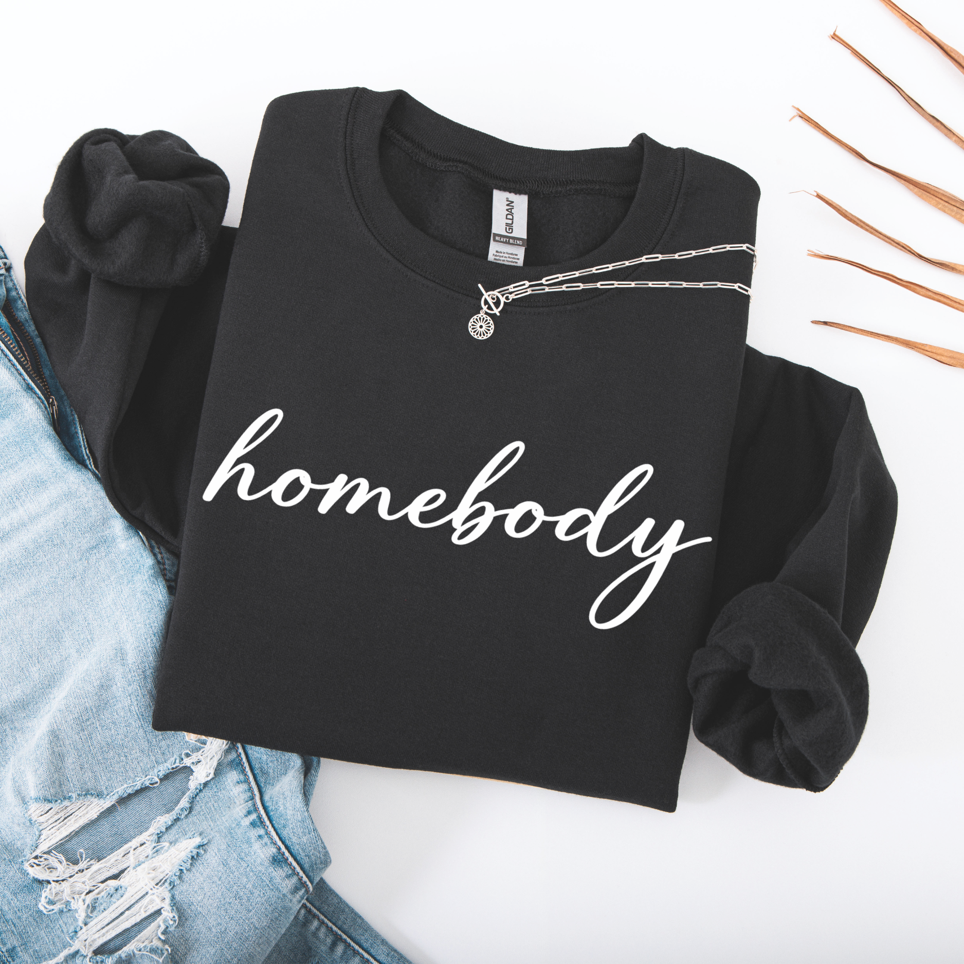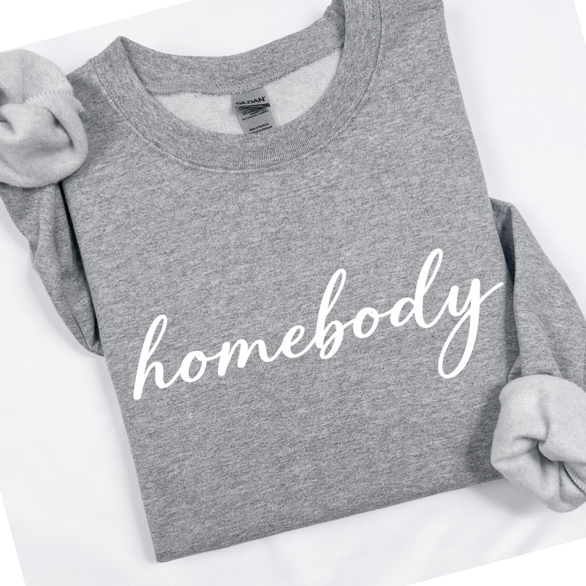 Graphite Gray sweatshirt with 'homebody' text on a white background